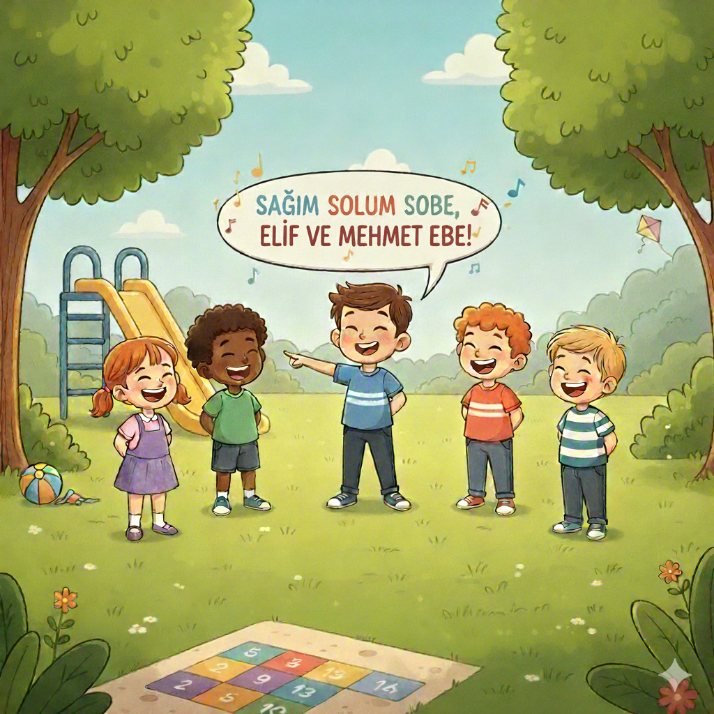 Oyun oynarken tekerleme söyleyen çocuklar (Görsel yapay zekâ ile oluşturulmuştur).