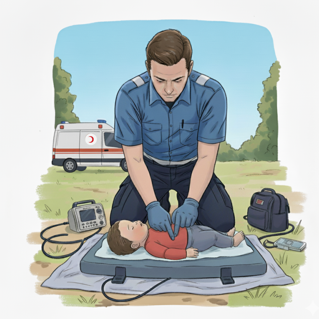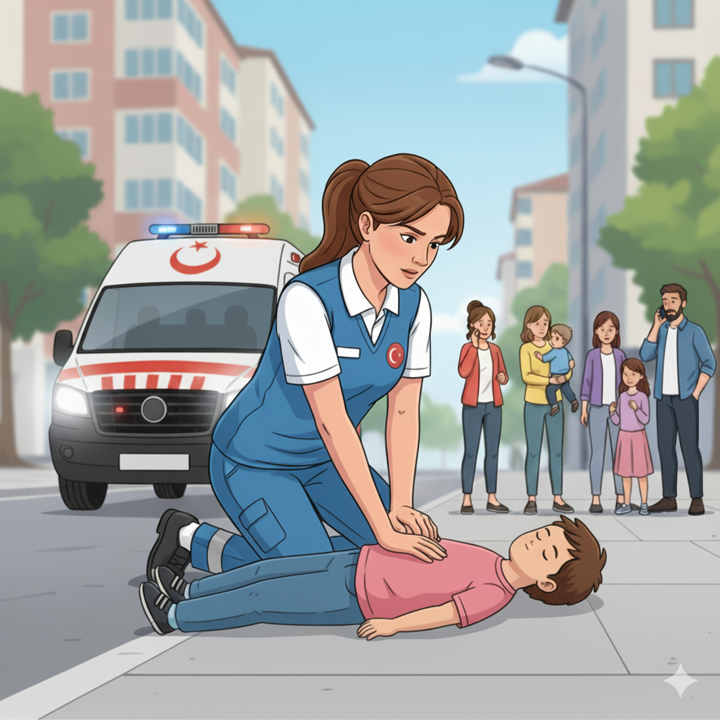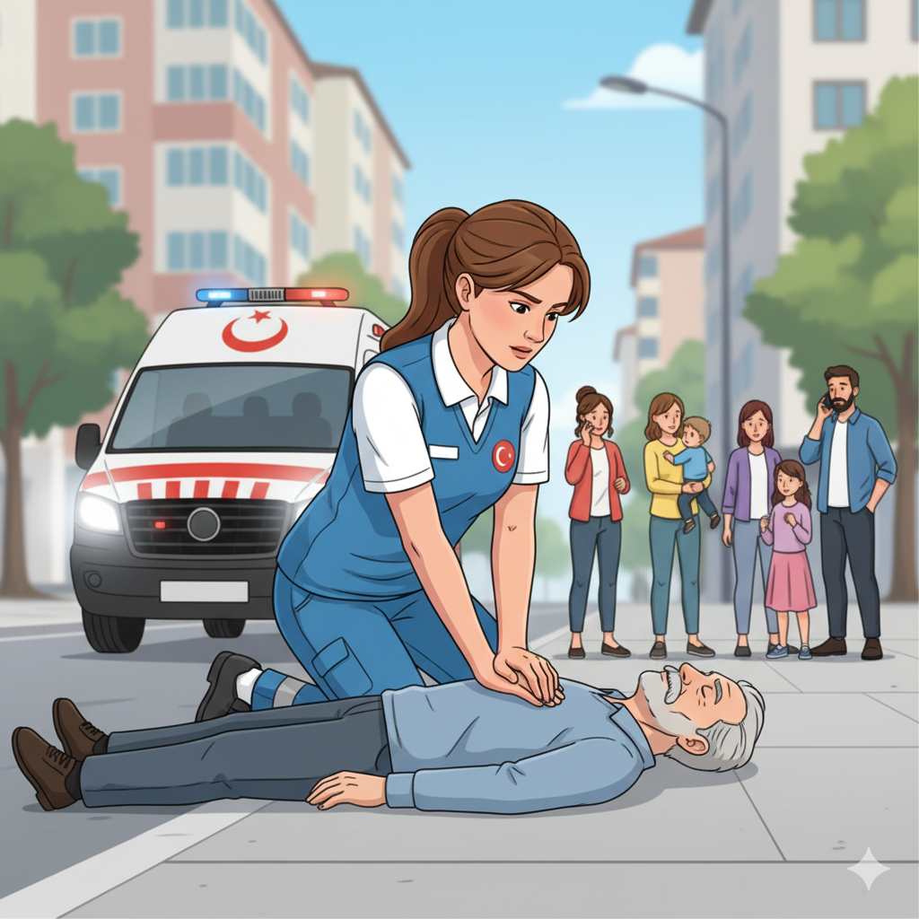 Acil tıp teknisyeni Temel Yaşam Desteği sağlarken (Yapay zekâ ile oluşturulmuştur).