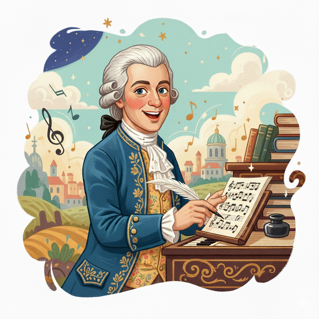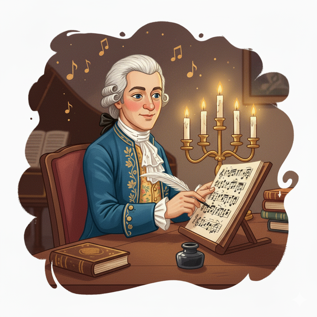 Mozart eserlerini bestelerken temsili (Görsel yapay zekâ ile oluşturulmuştur).