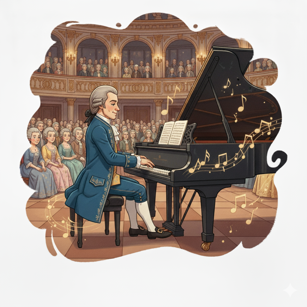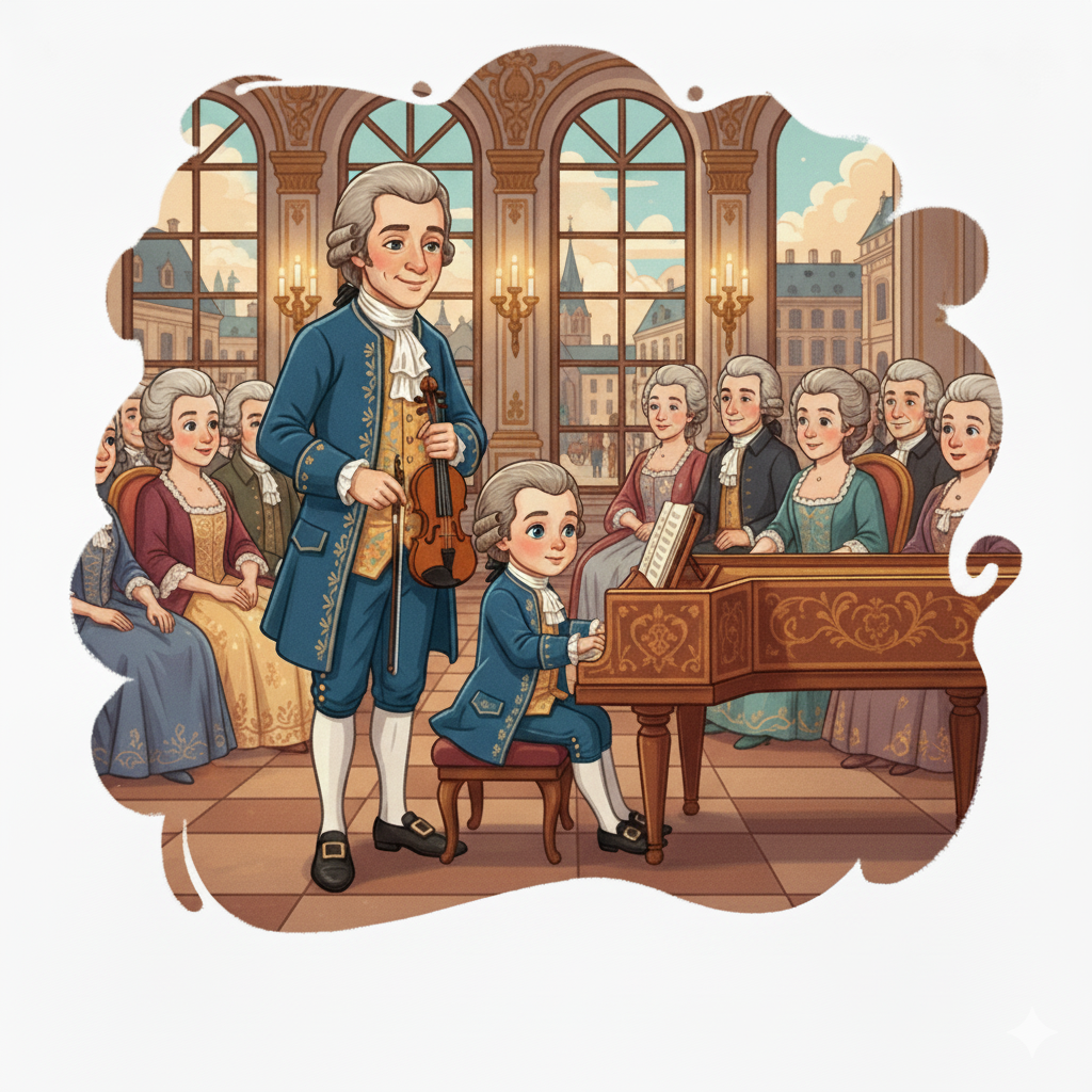 Küçük Mozart Avrupa’da ilk konserini verirken temsili (Görsel yapay zekâ ile oluşturulmuştur).