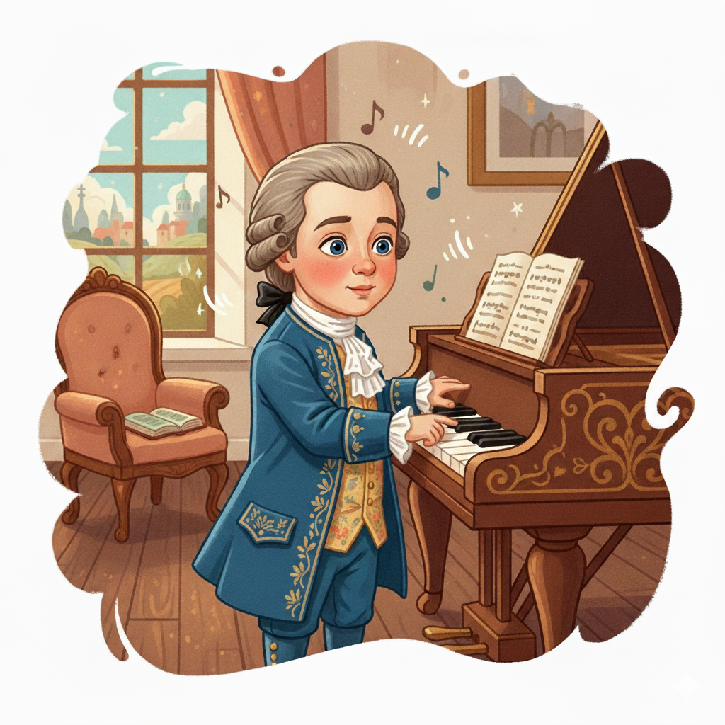 Mozart çocukluğunda piyano çalmaya başlarken temsili (Görsel yapay zekâ ile oluşturulmuştur).