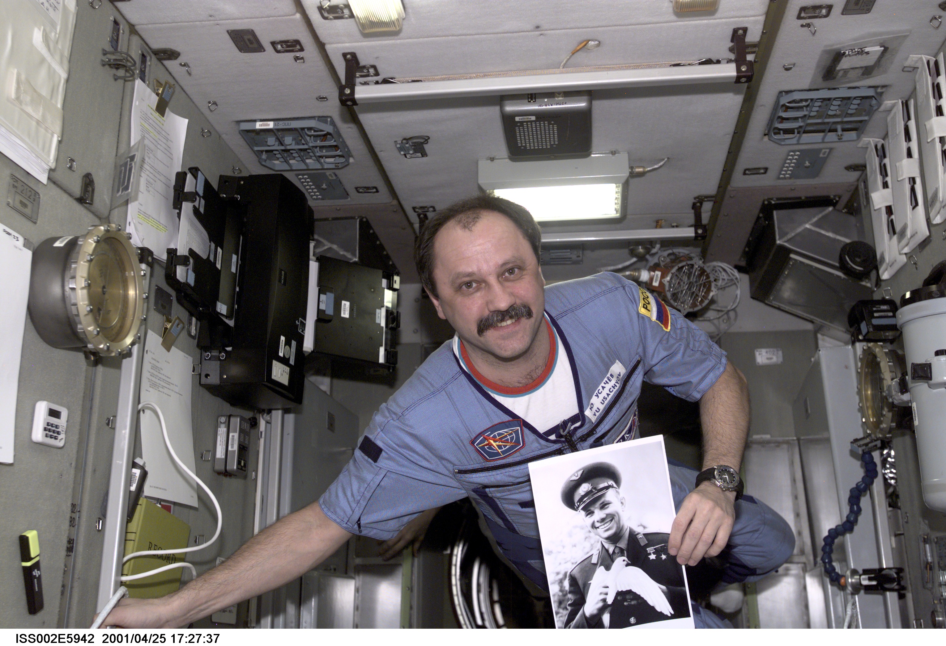Yury V. Usachev, Gagarin'in Uzaya Çıkan İlk İnsan Olmasının Yıldönümü Anısına Zvezda Servis Modülü'nde Gagarin'in Bir Fotoğrafını Tutuyor (Flickr)