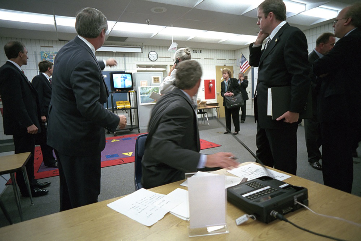 Savunma ve iç güvenlik kurumlarının tepe yöneticileri, sivil havacılık ve adlî birimlerle sürekli temas hâlinde bilgi akışını sürdürmüş; başkanın gün içindeki programı da bu kriz yönetiminin gereklerine göre şekillenmiştir. İletişim hattı, New York, Pentagon ve Shanksville’deki sahadaki operasyonları destekleyecek biçimde tek sesli bir bilgilendirme çizgisine oturtulmuştur.