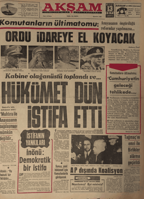 Böylece 12 Mart günü yaşananlar, önce askerî bildiri, ardından hükümetin çekilişi ve sonrasında Cumhurbaşkanlığı kanalıyla yasama organlarının resmî bilgilendirilmesi biçiminde ilerledi. Müdahalenin bu kurumsal zinciri, askerî komuta kademesinin tek başına hareket eden bir güç olmaktan çok, Cumhurbaşkanlığı ve yasama organlarını da aynı gün içinde yeni sürecin parçası hâline getirdiğini göstermektedir.