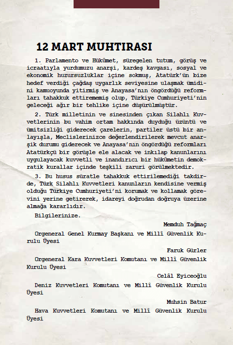 Metinde parlamentonun ve hükümetin ülkeyi anarşi, kardeş kavgası, sosyal ve ekonomik huzursuzluk içine sürüklediği ileri sürülmüş; anayasanın öngördüğü reformları uygulayacak, inkılâp kanunlarını sürdürecek ve “kuvvetli ve inandırıcı” bir hükümetin demokratik kurallar içinde kurulması istenmiş; bu husus süratle yerine getirilmezse Türk Silahlı Kuvvetleri’nin idareyi doğrudan üstleneceği bildirilmiştir. 12 Mart metninin bu kısa ve doğrudan yapısı, 9 Mart çevresindeki daha geniş rejim tasarılarından farklı olarak, aynı gün içinde yürütme üzerinde sonuç doğuracak bir askerî baskı belgesi niteliği taşımaktadır. Aşağıda, muhtıra metninin nihai hali yer almaktadır:【38】
