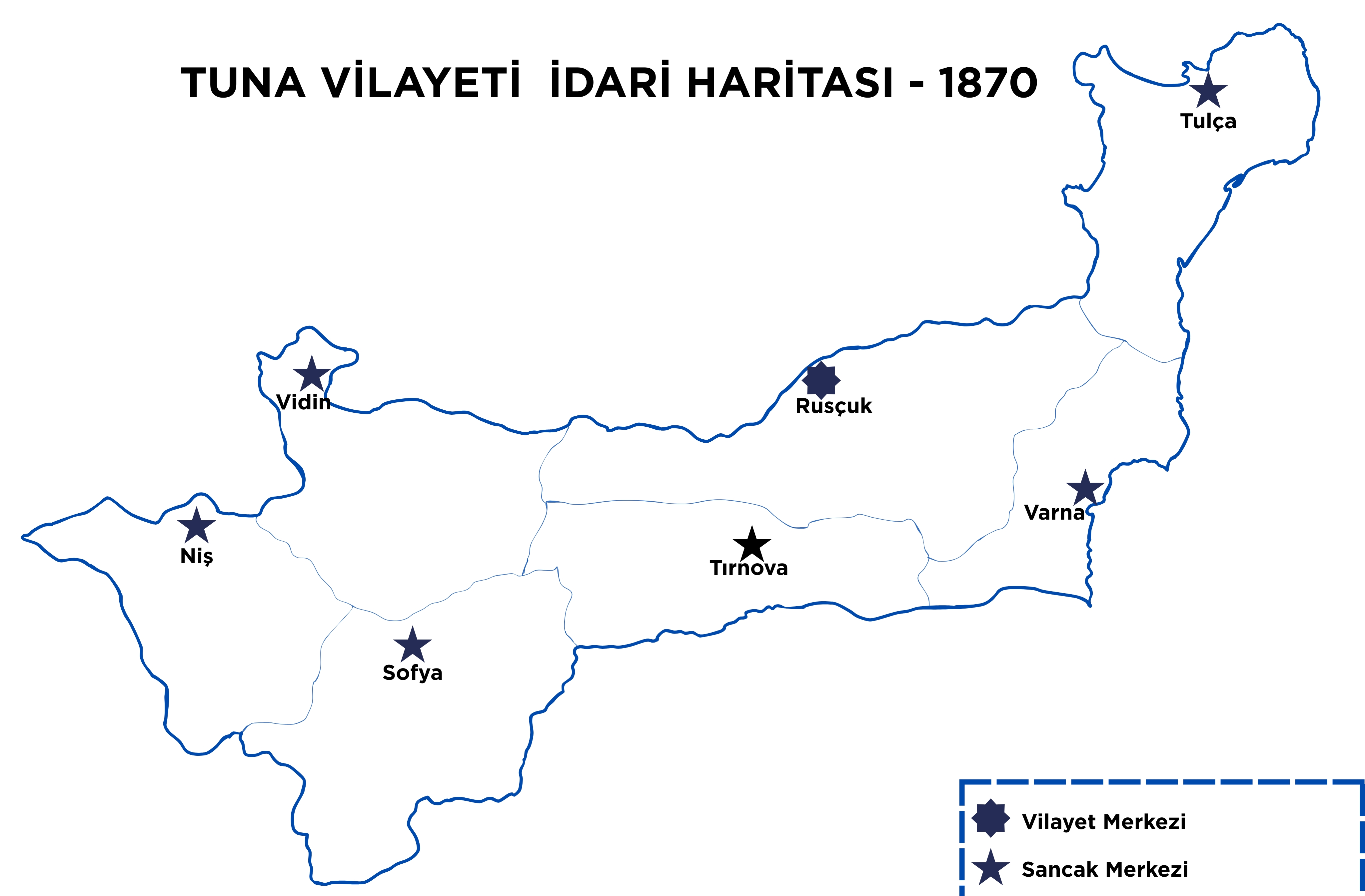 Tuna Vilâyeti: Rusçuk, Varna, Tulça, Vidin, Tırnova, Sofya ve Niş sancaklarına bölünmüştü. Her sancakta kazalara bölündü.
