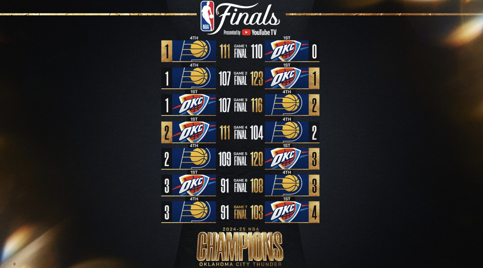 2025 NBA Finalleri, Oklahoma City Thunder’ın savunma organizasyonu, oyuncu gelişimi ve sezon geneline yayılan oyun yapısıyla şampiyonluk elde ettiği bir seri olmuştur. Indiana Pacers, Tyrese Haliburton’un sakatlığına rağmen seriyi dengeye taşıyabilmiş; ancak Thunder, üçüncü çeyrekten itibaren üstünlüğü koruyarak seriyi tamamlamıştır. Shai Gilgeous-Alexander’ın sezon boyunca sergilediği performans öne çıkmış; Thunder’ın savunması ve kadro derinliği serinin tamamına yansımıştır. NBA tarihinde sınırlı sayıda yaşanan yedinci maç finallerinden biri olarak kayda geçen bu seri, Oklahoma City’nin yeniden yapılanma sürecinin bir sonucu olarak değerlendirilmiştir.