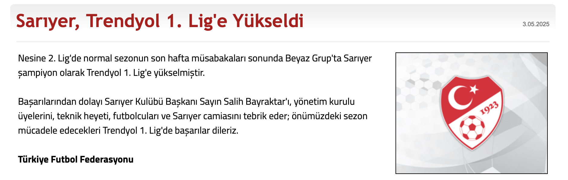 Karşılaşmanın hemen ardından Türkiye Futbol Federasyonu (TFF), Sarıyer’in Beyaz Grup şampiyonluğunu resmen ilan etmiştir. TFF açıklamasında Sarıyer Başkanı Salih Bayraktar, teknik heyet, futbolcular ve kulüp çalışanları tebrik edilmiştir . Açıklamada ayrıca Sarıyer’in 2025–26 sezonunda Trendyol 1. Lig’de mücadele edeceği belirtilmiştir. TFF’nin duyurusuyla birlikte Sarıyer’in şampiyonluğu resmiyet kazanmış, takım lig yükselme hakkını matematiksel olarak da elde etmiştir.