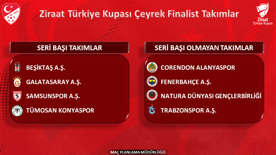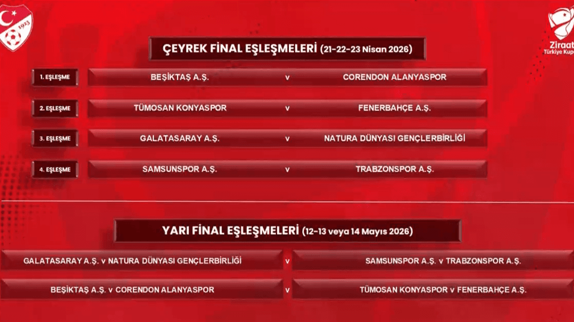 Türkiye Futbol Federasyonu tarafından düzenlenen Ziraat Türkiye Kupası'nın çeyrek final ve yarı final eşleşmelerini belirleyen kura çekimi, 11 Mart 2026 tarihinde gerçekleştirilmiştir. Kulüp yetkililerinin de katılım gösterdiği bu organizasyon, İstanbul Finans Merkezi bünyesinde yer alan Ziraat Bankası Oditoryumu'nda düzenlenmiş ve A Spor kanalı üzerinden canlı olarak ekranlara getirilmiştir. Kura döneminde paylaşılan bilgilere göre, Türkiye Kupası organizasyonunun yeni sezondan itibaren eleme usulü formatına göre oynanacağı bilgisi de kamuoyuna duyurulmuştur.