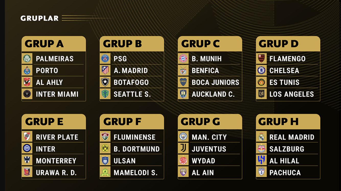 - A Grubu: Palmeiras (Brezilya), FC Porto (Portekiz), Al Ahly (Mısır), Inter Miami CF (ABD)