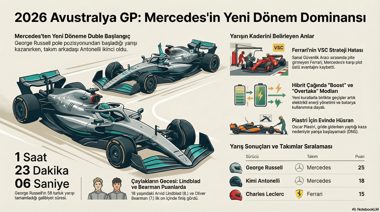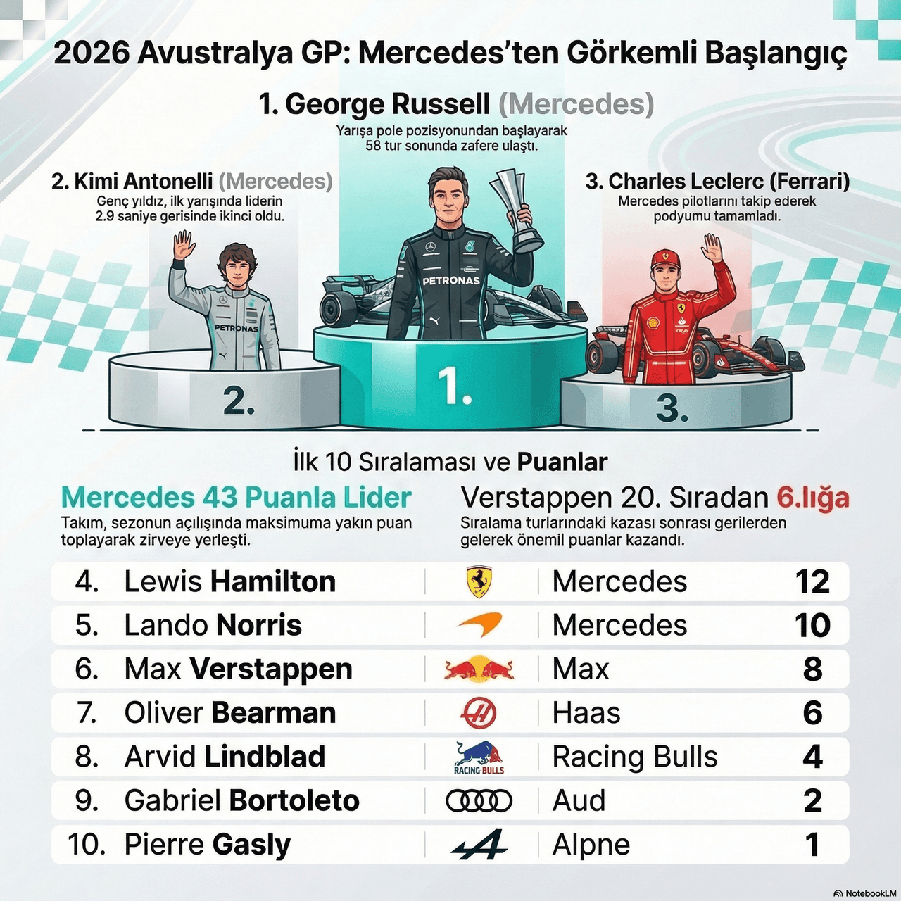 2026 Formula 1 sezonunun açılış mücadelesi olan Avustralya Grand Prix'sini, Mercedes takımının pilotu George Russell kazanmıştır. Yarışta ikinciliği Russell'ın takım arkadaşı Kimi Antonelli, üçüncülüğü ise Ferrari pilotu Charles Leclerc elde etmiştir. Yeni hibrit güç ve batarya kurallarının uygulandığı bu yarış; ev sahibi pilot Oscar Piastri'nin yarış öncesi kaza yaparak mücadeleye katılamaması, sanal güvenlik aracı periyotları ve Mercedes ile Ferrari takımlarının uyguladığı zıt pit stop stratejileri etrafında şekillenmiştir.