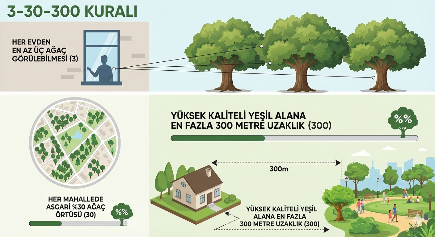 Bu kural, kentsel ormancılığı yalnızca estetik veya çevresel bir unsur olarak değil, kentsel yaşamın temel bileşenlerinden biri olarak ele almaktadır. Ağaçlar ve yeşil alanlar, konut çevresinden mahalle ölçeğine ve kent geneline uzanan bir sistem içinde değerlendirilmektedir. 3-30-300 kuralı, kentsel yeşil altyapının sürekliliğini sağlamayı, yeşil alanlara erişimde eşitliği gözetmeyi ve kentlerin daha yaşanabilir, dayanıklı ve doğayla bütünleşik mekânlar haline gelmesini hedefleyen bir çerçeve olarak tanımlanmaktadır.