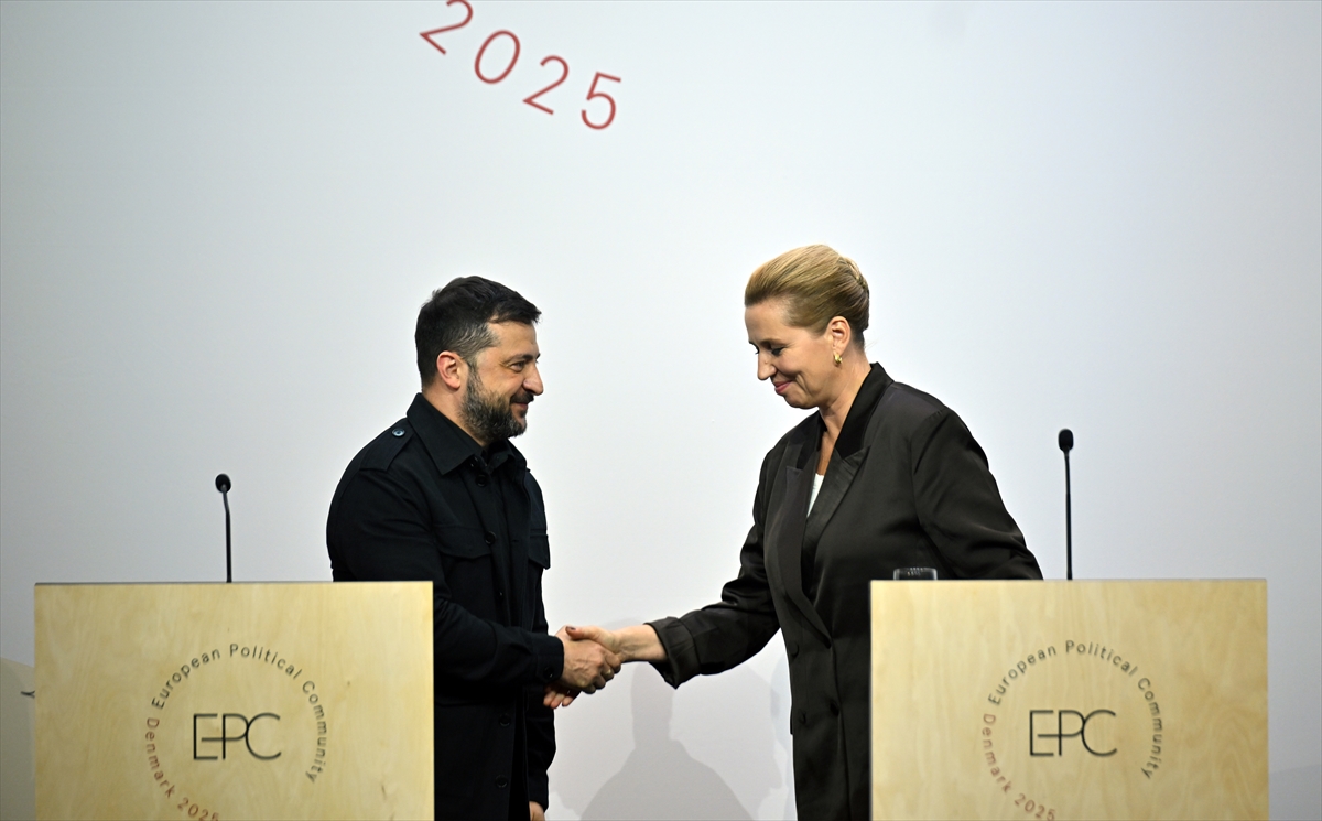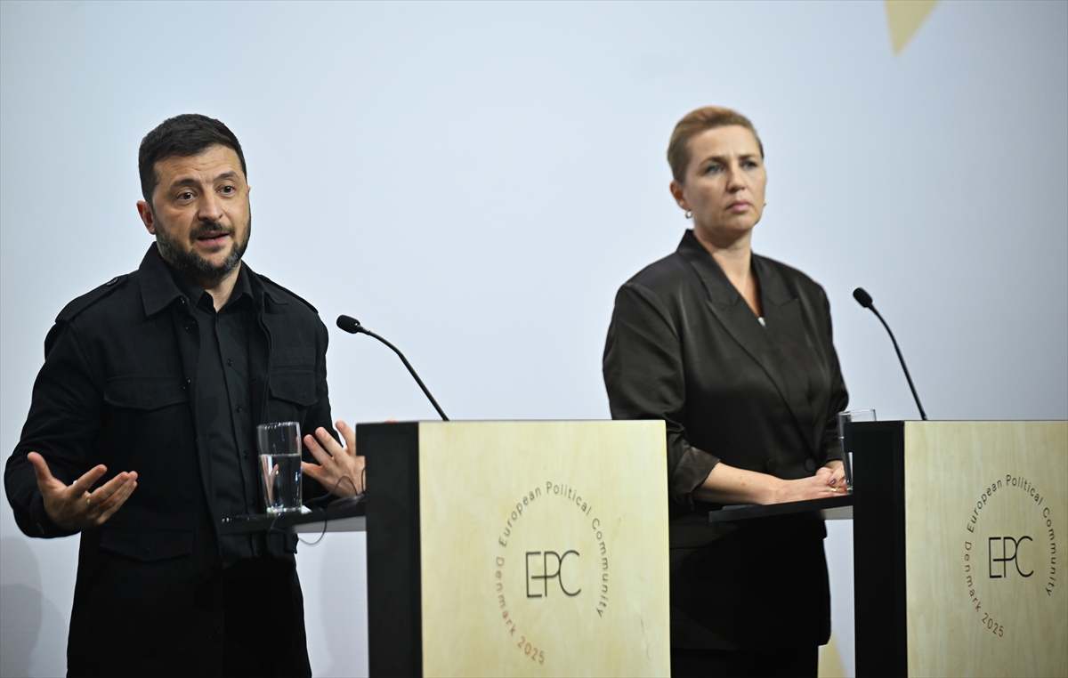 Danimarka'nın ev sahipliğinde başkent Kopenhag'da düzenlenen Avrupa Siyasi Topluluğunun (AST) 7'nci zirvesine katılan Ukrayna Devlet Başkanı Volodimir Zelenskiy ve Danimarka Başbakanı Mette Frederiksen ortak basın toplantısı düzenliyor, 2 Ekim 2025 - (Anadolu Ajansı)