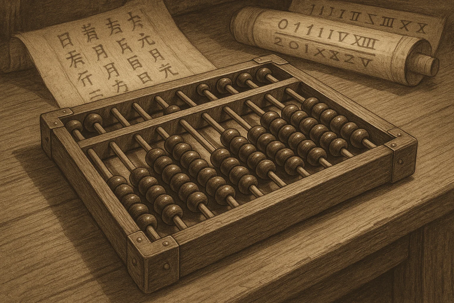 Çin kökenli abaküs, dikey çubuklar üzerinde dizilmiş iki bölümlü boncuklardan oluşur. Üstteki iki boncuk beşer, alttaki beş boncuk birer birimi temsil eder. Bu yapı sayesinde hem onluk hem altmışlık sistemlerde işlem yapılabilmektedir. M.Ö. 11. yüzyıldan itibaren kullanıldığı ve sonraki yüzyıllarda geliştirilerek Doğu Asya’nın temel hesap aracı hâline geldiği bilinmektedir.