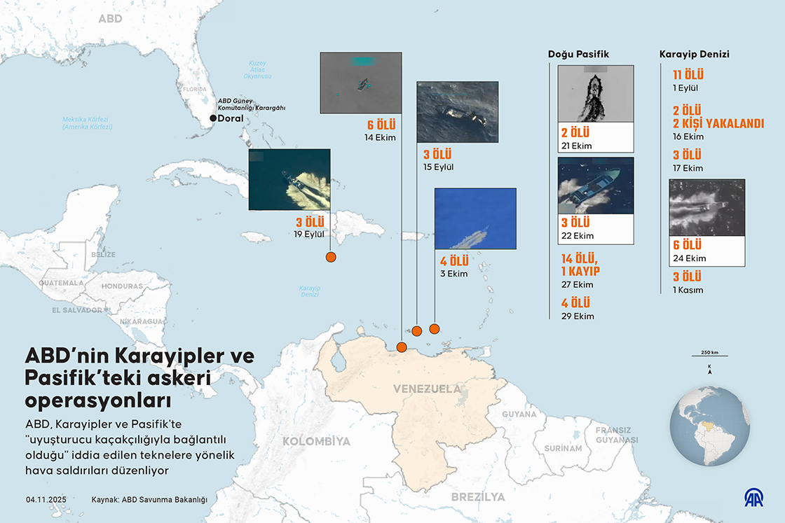 2 Eylül - 4 Kasım 2025 Tarihleri Arasında ABD’nin Karayipler ve Pasifik’teki Askeri Operasyonlarını Gösteren İnfografik - (Anadolu Ajansı)