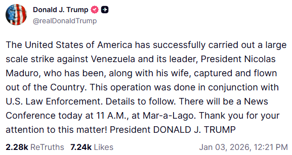 ABD Başkanı Donald Trump, 3 Ocak 2026’da Truth Social hesabından yaptığı paylaşımda, Venezuela’ya yönelik saldırıların ABD tarafından gerçekleştirildiğini duyurmuştur. Trump, açıklamasında şu ifadeleri kullanmıştır: "ABD, Venezuela ve lideri Başkan Nicolas Maduro'ya karşı büyük çaplı bir saldırı düzenlemiş ve Maduro ile eşi yakalanarak ülke dışına çıkarılmıştır."