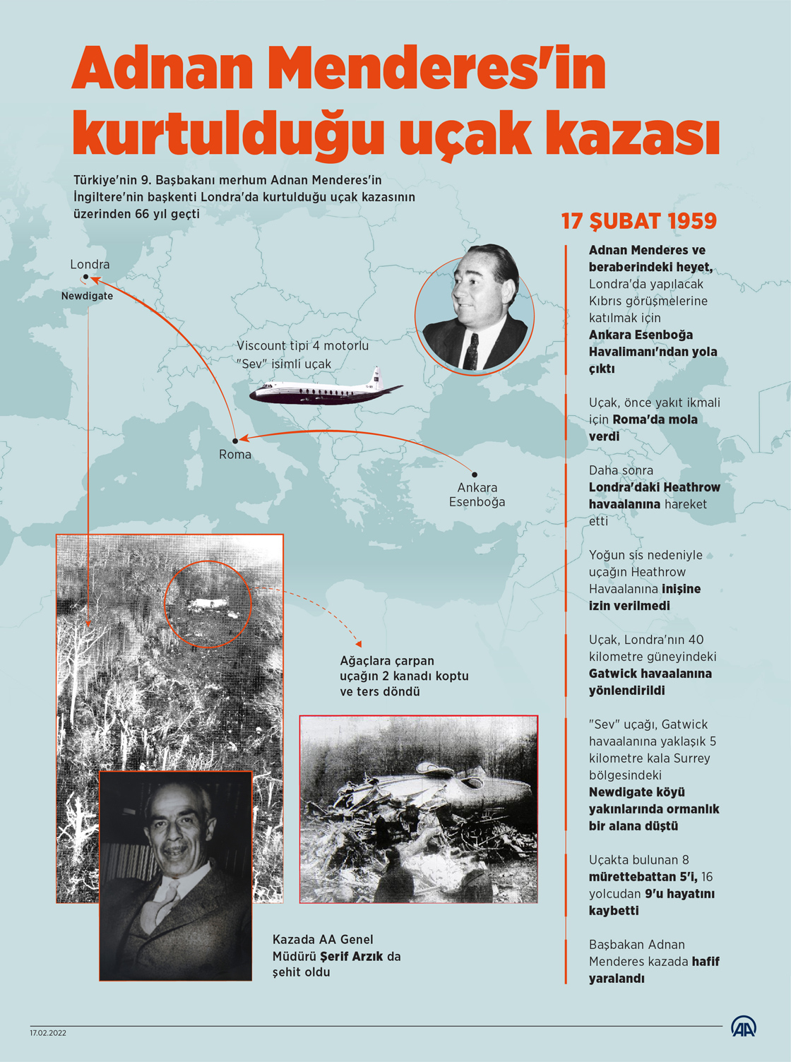 Türkiye Cumhuriyeti Başbakanı Adnan Menderes’in 17 Şubat 1959 tarihinde Londra’da yapılacak Kıbrıs Konferansı’na katılmak üzere Ankara’dan havalanan uçağı, İngiltere’nin Gatwick Havalimanı yakınlarında yoğun sis nedeniyle kaza geçirmiştir. İçerisinde hükûmet üyeleri ve gazetecilerin de bulunduğu uçakta 14 kişi yaşamını yitirmiş; Menderes kazadan sağ kurtulmuştur. Olay hem diplomatik süreci hem de Türk iç siyasetini etkileyen gelişmelerden biri olarak kayda geçmiştir.