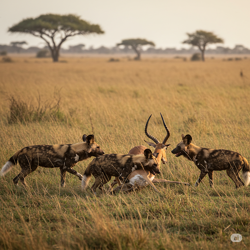 Afrika Yaban Köpekleri Avlanıyor (Yapay Zeka Tarafından Oluşturulmuştur)