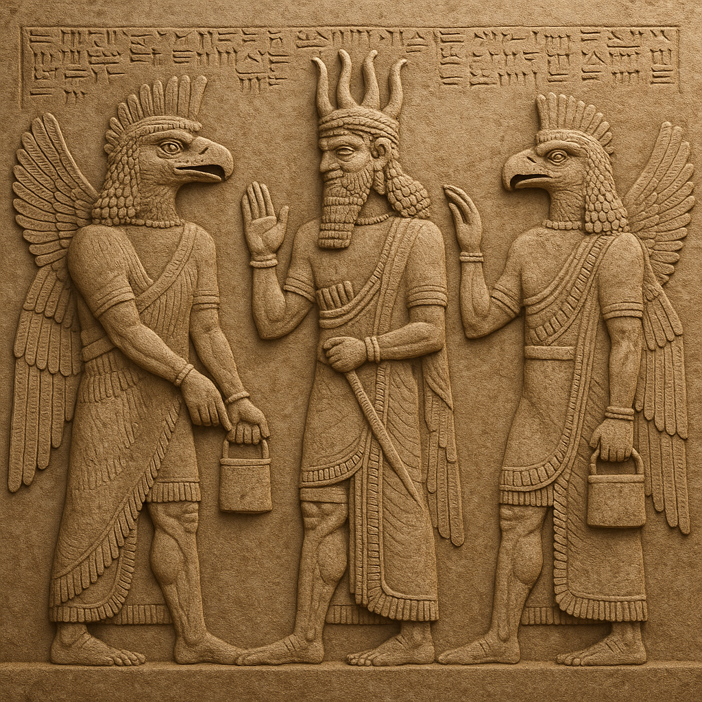 Anunnakileri Tasvir Eden Taş Rölyefi (Yapay Zeka ile Oluşturulmuştur)