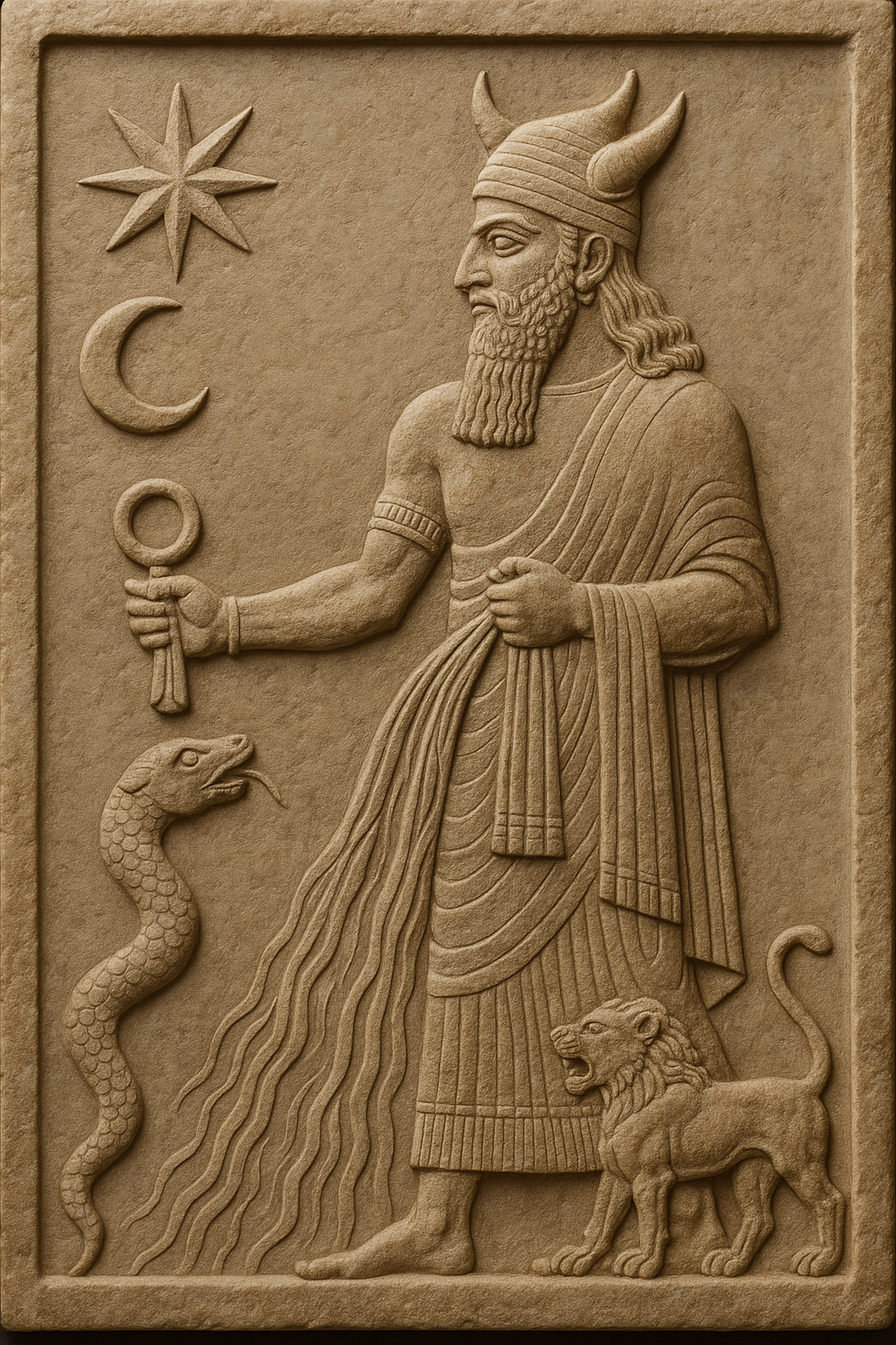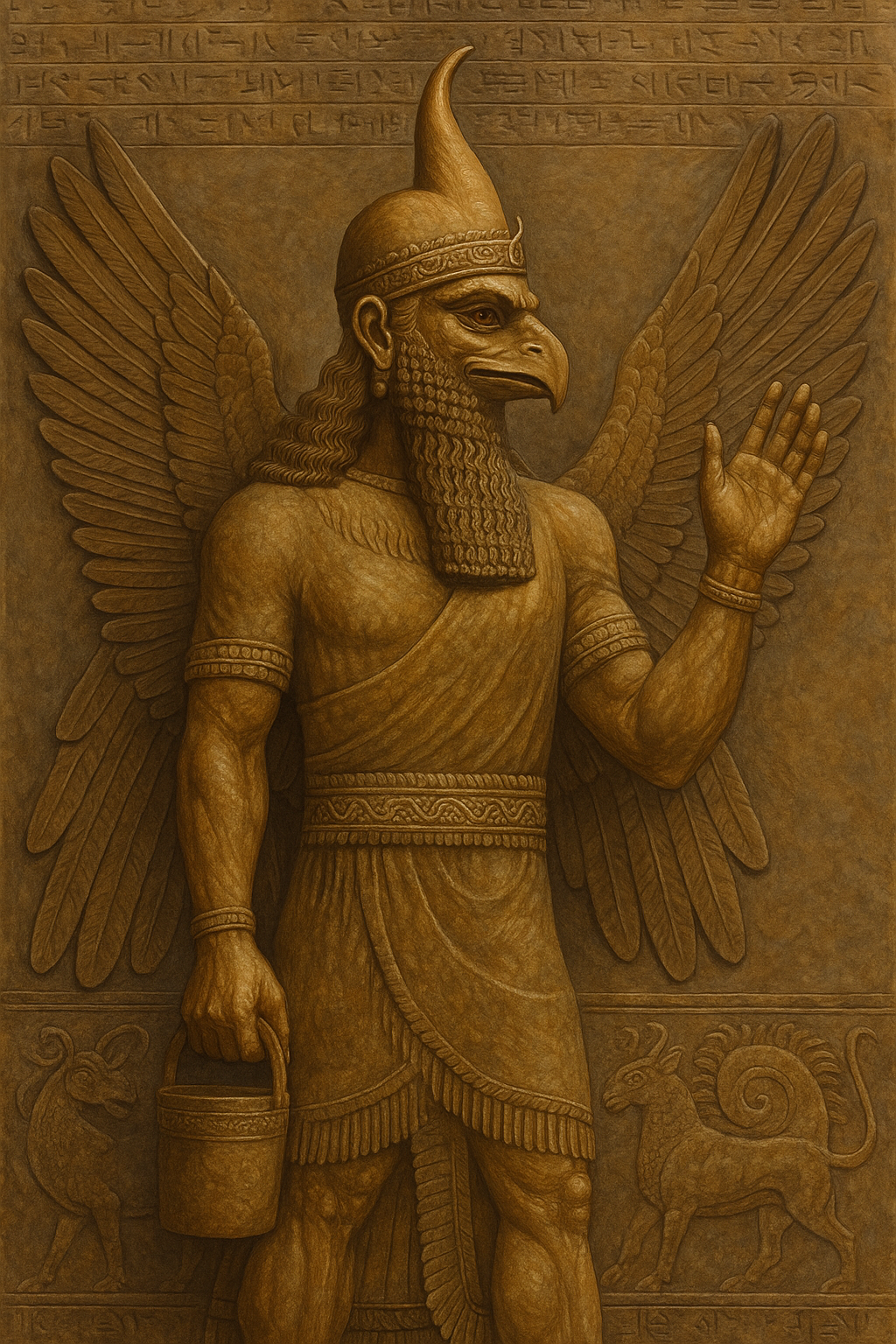 Sümer Tanrısı Enki'nin Taş Rölyef Temsili (Yapay Zeka ile Oluşturulmuştur)