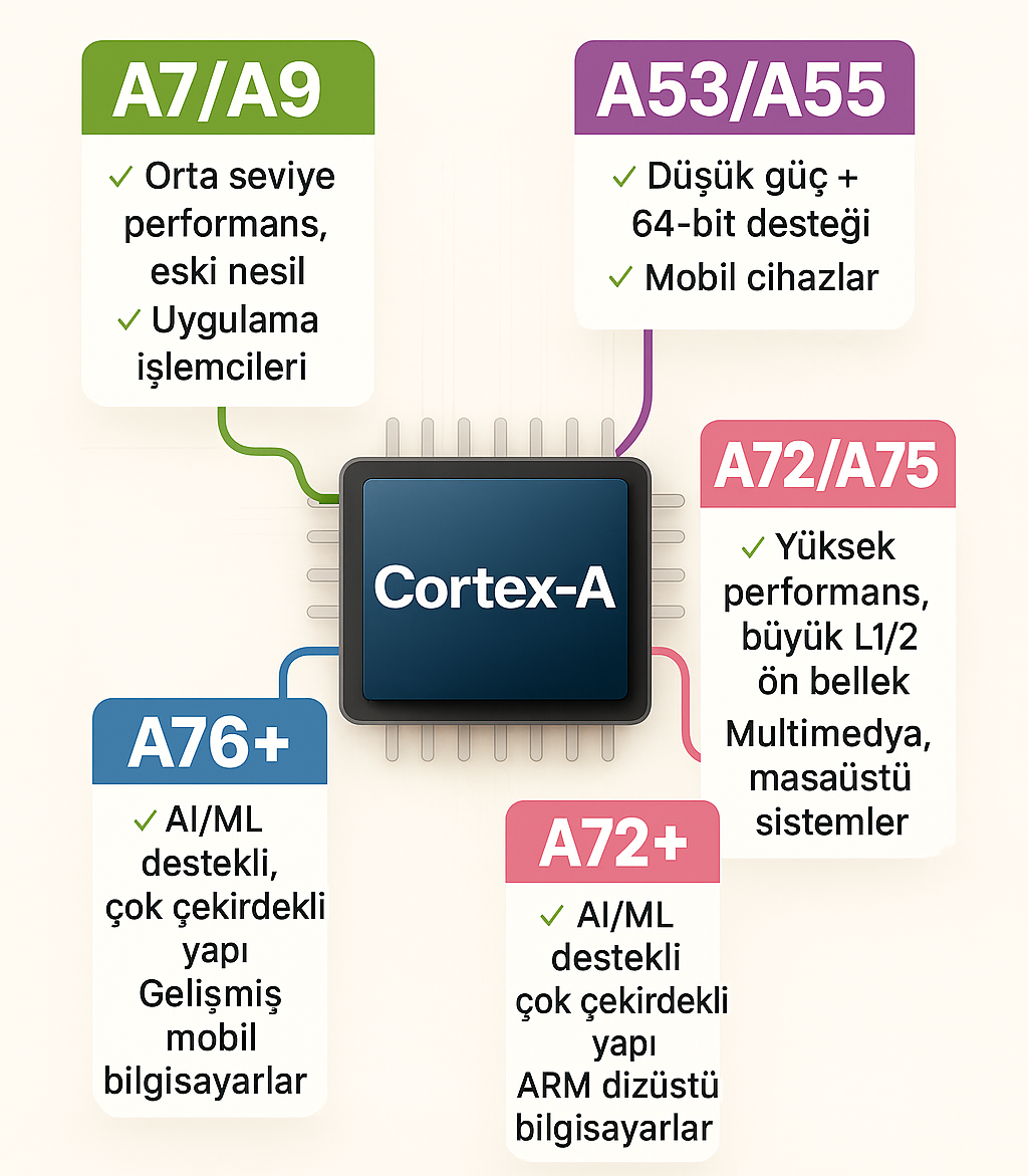ARM Cortex-A Serisinin Teknik Özellikleri ve Tipik Uygulama Alanları (Yapay Zekâ ile Oluşturulmuştur.)