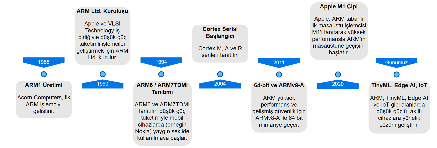 ARM mimarisinin kökeni, 1980’li yıllarda Acorn Computers tarafından geliştirilen Acorn RISC Machine tasarımına dayanır. Bu ilk mimari, düşük transistör sayısı ve yüksek verimlilik hedefiyle yola çıkmış, 1985 yılında ilk işlemci prototipi olan ARM1 üretilmiştir. Devam eden süreçte Apple ve VLSI Technology’nin ortaklığıyla 1990 yılında ARM Ltd. kurulmuş ve mimari evrimleşerek yaygınlaşmıştır. 1994 yılında sunulan ARM6 serisi, mobil uyumluluğu ile dikkat çekerken; ARM7TDMI modeli, gömülü sistemler dünyasında büyük kabul görmüş, örneğin Nokia telefonlarında kullanılmıştır. 2004 itibarıyla tanıtılan Cortex serisi (M, A, R) ise mimariyi segmentlere ayırarak her uygulama türü için optimize edilmiş çözümler sunmuştur. Zaman içinde ARM mimarisi, sadece işlemci değil; yazılım geliştirme araçları, güvenlik çözümleri ve yapay zekâ hızlandırıcıları da barındıran bir ekosisteme dönüşmüştür. Apple’ın ARM tabanlı M1 ve M2 çipleriyle birlikte, bu mimari yalnızca gömülü sistemlerde değil, masaüstü ve dizüstü bilgisayarlarda da kendine yer bulmuştur.