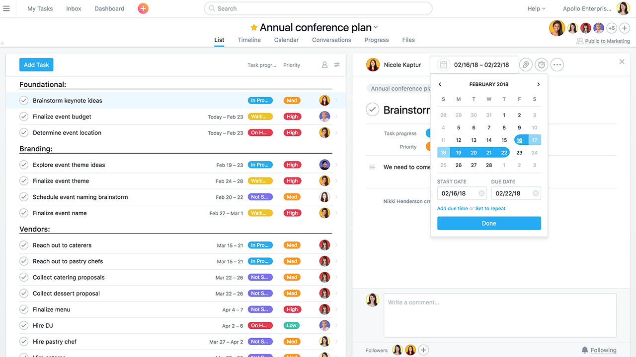Asana’da görevler (tasks) ve alt-görevler tanımlanabilir; her görev bir proje altında atanabilir, teslim tarihi, sorumlu kişi ve ek bilgiler (örneğin dosya ekleri, yorumlar) içerebilir. Projeler çeşitli görünümlerde izlenebilir: liste görünümü, pano (Kanban) görünümü, takvim görünümü ve zaman çizelgesi (Gantt) görünümü gibi esnek düzenler sunulur. Örneğin zaman çizelgesi görünümü, görev bağımlılıklarını belirleyerek projenin sürecini görselleştirir. Ayrıca özel alanlar (custom fields) sayesinde görevler ek veri etiketleriyle zenginleştirilebilir; bu da görevlerin tür, öncelik veya maliyet gibi kriterlere göre filtrelenebilmesini ve raporlanabilmesini sağlar.