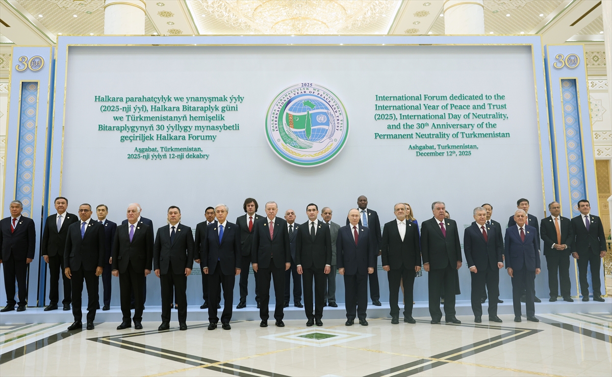 Türkmenistan Maslahatlar Merkezi'nde resmi karşılama töreninin ardından çekilen aile fotoğrafı, 12 Aralık 2025 - (Anadolu Ajansı)