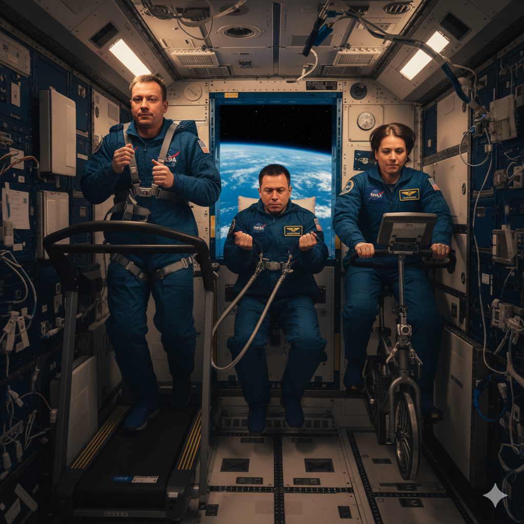 Uzayda yaşamın en zorlu kısmı, insan vücudunun yerçekimsiz ortama verdiği tepkilerdir. Kas kütlesi her gün biraz daha azalır, kemik yoğunluğu düşer, sıvılar baş bölgesinde birikir. Bu etkileri dengeleyebilmek için astronotlar her gün iki saate yakın egzersiz yapmak zorundadır.【5】 İstasyonda koşu bandı, sabit bisiklet ve ARED adı verilen direnç cihazı bulunur. Koşu bandına bağlı kalmak için astronotlar özel bir kemerle kendilerini sabitler; aksi hâlde ayakları yerden kesilip tavana çarpar. ARED sistemi ise pistonlarla direnç oluşturarak ağırlık kaldırma etkisi yaratır. Bu egzersizler, yalnızca fiziksel değil psikolojik bir zorunluluktur. Uzayın sessizliği, izole ortamı ve sürekli görev disiplini, insan zihninde baskı oluşturabilir. Egzersiz yapmak, vücudu güçlendirdiği kadar zihni de canlı tutar. Astronotlar genellikle müzik eşliğinde çalışır, bazen de Dünya’yı izleyerek koşar.