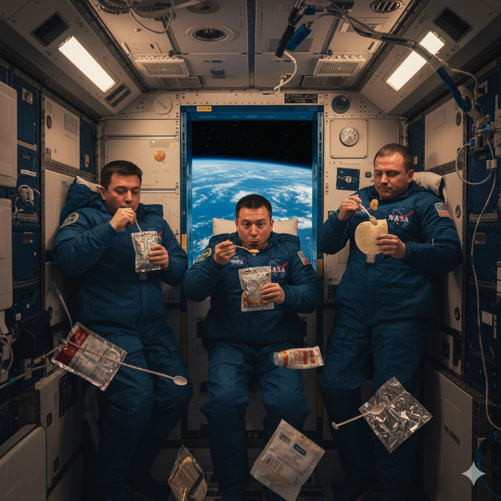 Kahvaltı, hem enerji kaynağı hem de moral deposudur. Ancak uzayda yemek yeme eylemi, tamamen yeniden tanımlanmıştır. Astronotların yiyecekleri, vakumlu poşetler içinde saklanır ve tüketilmeden önce sıcak suyla rehidre edilir. Menüler genellikle dondurularak kurutulmuş yumurta, tahıl gevreği, meyve püreleri, protein barları ve toz hâlinde içeceklerden oluşur. Mikro yerçekimi nedeniyle kan vücutta eşit dağılır; bu da burun tıkanıklığı ve tat alma duyusunun azalmasına yol açar. Bu yüzden astronotlar genellikle yemeklerine acı sos, hardal veya baharat ekler. NASA, astronotların damak zevkini koruyabilmek için özel menüler geliştirir; her ülkenin astronotu, kendi kültürüne ait bazı yiyecekleri de yanında götürebilir. Kamp yemekleri arasında Japon körisi veya Rus gevreği ve çorbaları da yer alabilir. 【3】