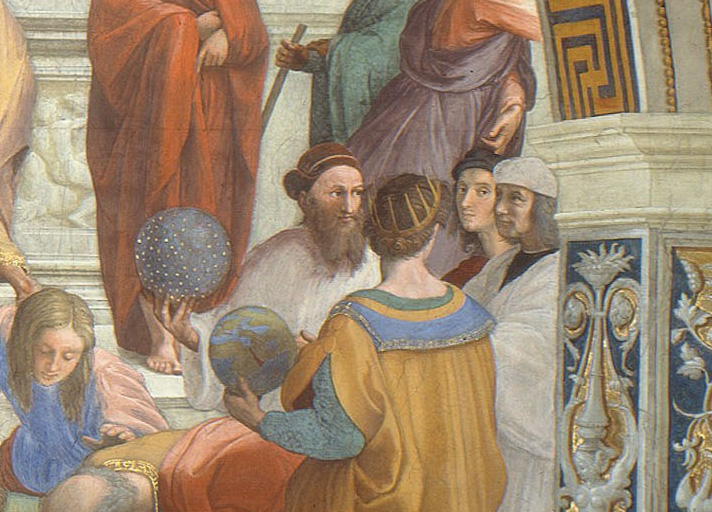 Ptolemaios, Zoroaster’in hemen yanında yer alır ve elinde dünya küresi tutar. Bu sahne, yeryüzüne dair bilimsel bilginin, coğrafi ve astronomik sistemlerin temsili olarak okunur. Antik dünyada büyük etkisi olan Ptolemaios’un kozmolojisi, evrenin merkezine dünyayı yerleştirmiştir. Zoroaster ile birlikte evrenin iki yönlü bilgisini —göksel ve yersel— temsil eden bir çift oluştururlar.