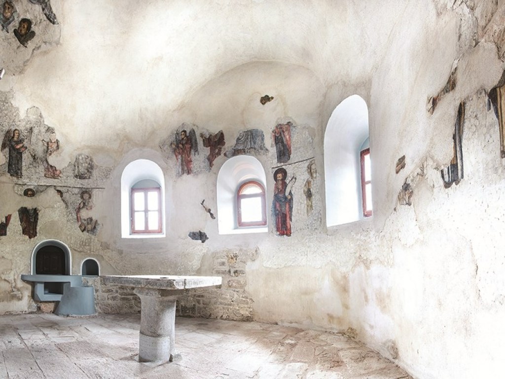 - Kuzeydoğu payede kazınmış bir freskin varlığına dayanarak, karşılıklı ikili başmelek geleneğine uygun olarak burada muhtemelen Başmelek Cebrail (Gabriel) figürünün bulunduğu düşünülmektedir.