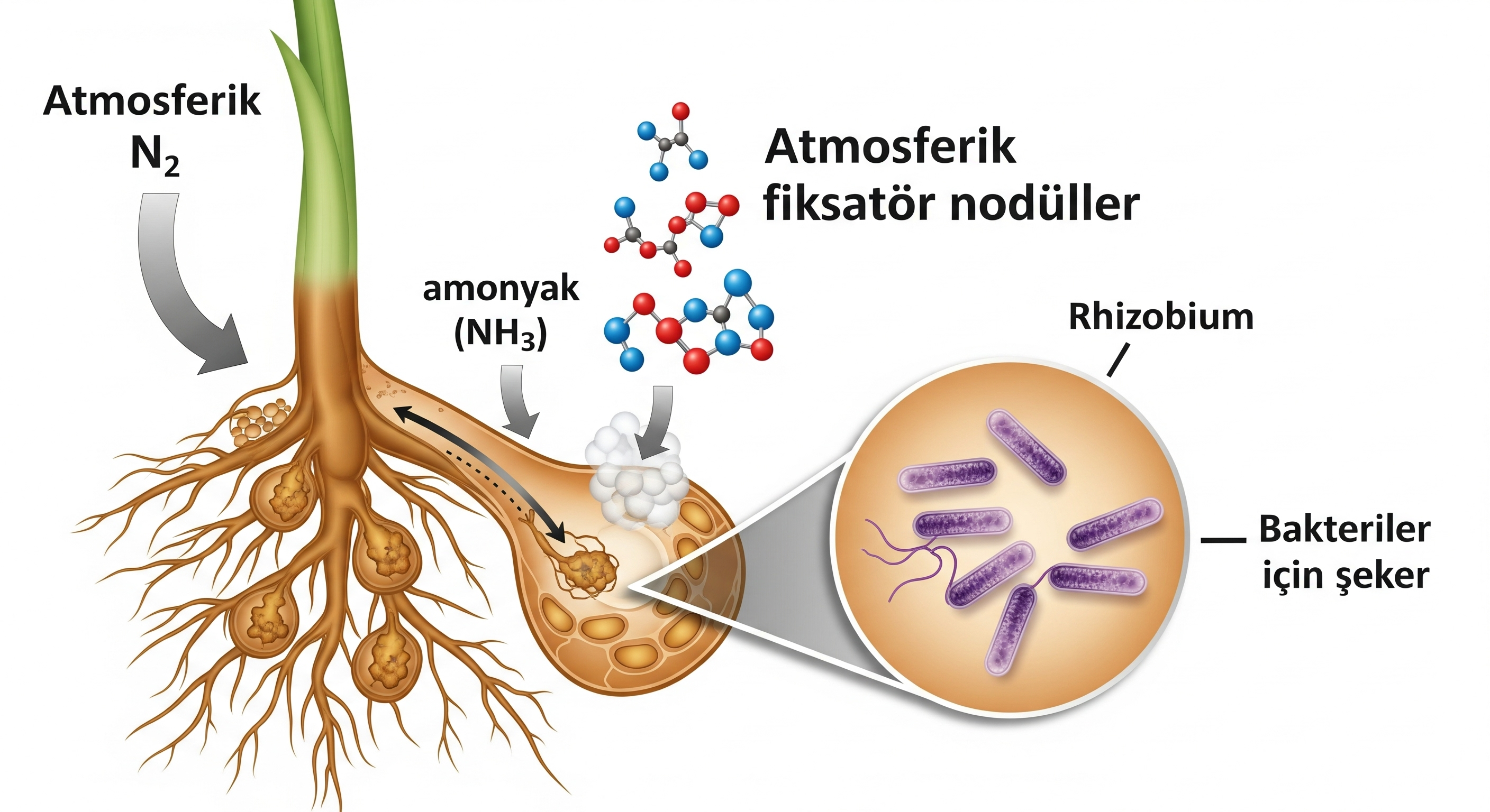 - Azot (N): Topraktaki yüksek düzeyde mineral azot (özellikle nitrat), nodül oluşumunu ve nitrogenaz enziminin aktivitesini engeller. Düşük miktarda başlangıç azotu ise bitkinin ilk gelişimini destekleyerek nodülasyonu teşvik edebilir.