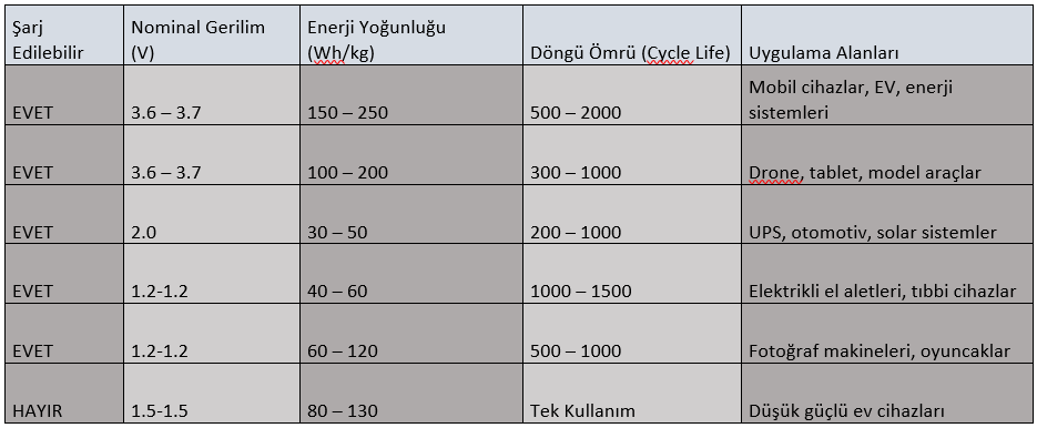 Batarya teknolojileri, kullanım senaryosuna göre farklılık gösterir. Aşağıdaki tabloda yaygın batarya türlerinin teknik özellikleri karşılaştırmalı olarak sunulmuştur: