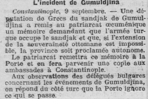 Fransız basınında süreç gün gün izlenmiştir: Le Petit Journal’da “Gümülcine’de yaşayanlar Bulgarları şehirden kovuyor” ve Le Matin’de “Gümülcine ve Kırcaali Bulgar olmayı reddetti” gibi başlıklar yayımlanmış; La Lanterne’de de Dedeağaç’a dair düzenleme aktarılmıştır.