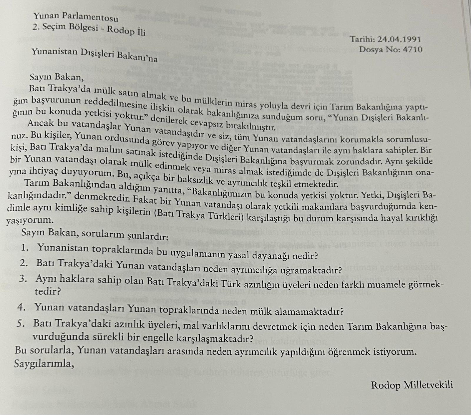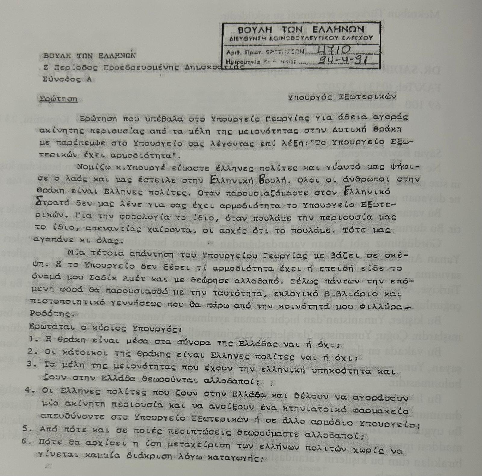 Doktor Sadık Ahmet'in Batı Trakya Türkleriyle İlgili Yunan Meclisinde Verdiği Soru Önergesi (Murat Derin)【10】
