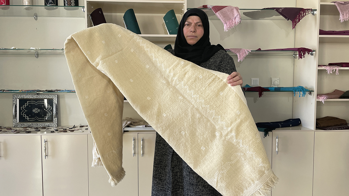 Sevim Ataner, AA muhabirine ehram dokumacılığını tanıtıyor (Anadolu Ajansı)
