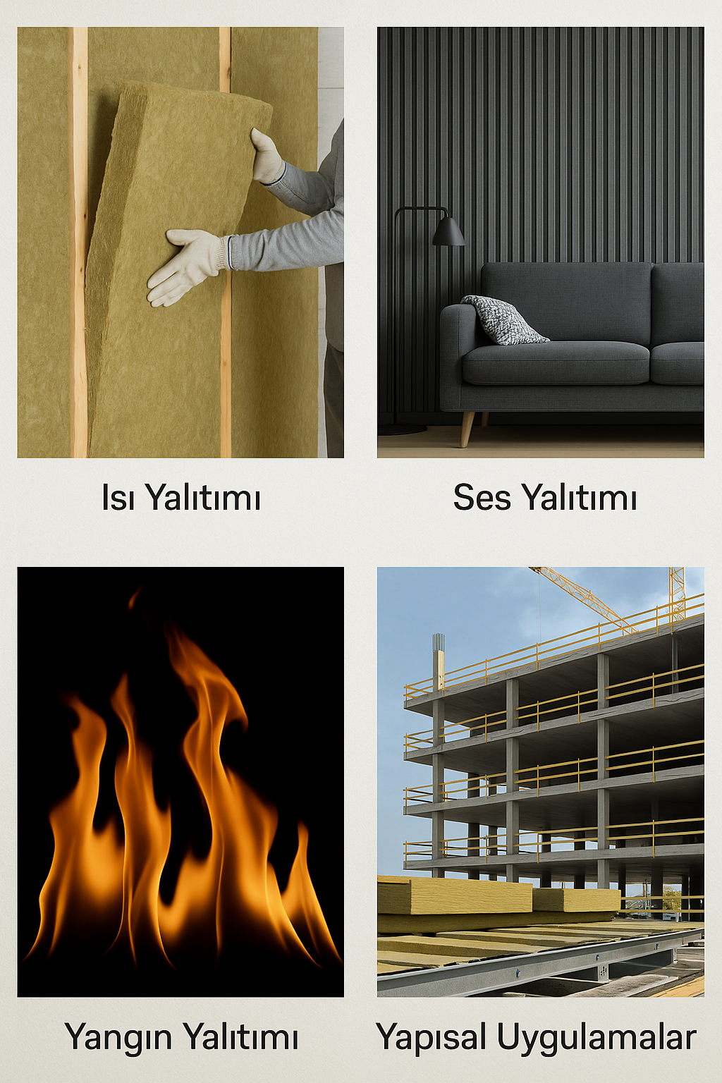 Taş yünü, çatı ve cephe kaplamaları, dış cephe mantolama sistemleri, iç bölme duvarları, havalandırmalı cephe sistemleri, tesisat yalıtımı ve sandviç panel uygulamaları gibi pek çok alanda kullanılmaktadır. Aynı zamanda kazan, fırın, boru hatları ve gemi inşa sektöründe yüksek sıcaklığa dayanımı nedeniyle tercih edilir. Yüksek ısıya, sese ve yangına karşı dayanıklılığı sayesinde enerji santrallerinde, endüstriyel fırınlarda ve akustik kontrol gereken mekanlarda da yaygın olarak kullanılır. Yeni yapılarda olduğu kadar mevcut binaların yalıtım amaçlı iyileştirilmesinde de etkili bir malzemedir.
