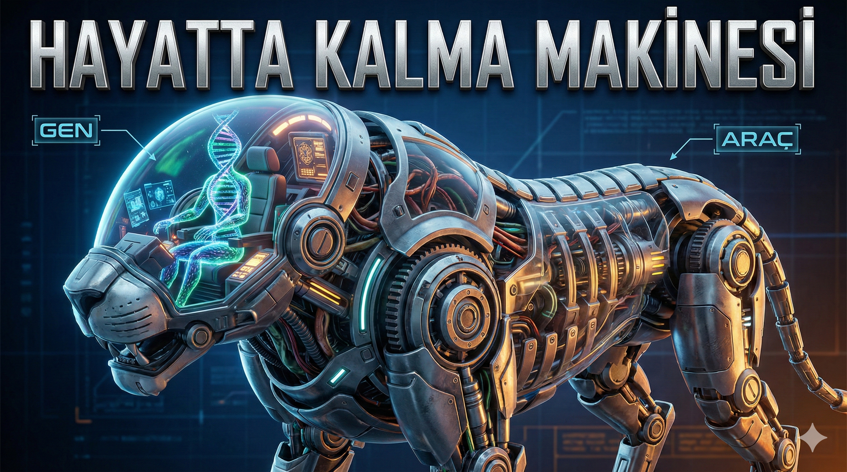Richard Dawkins'in "Hayatta Kalma Makinesi" Analojisi: Genlerin Yönettiği Biyolojik Bir Araç Tasviri (Yapay Zeka İle Oluşturulmuştur)