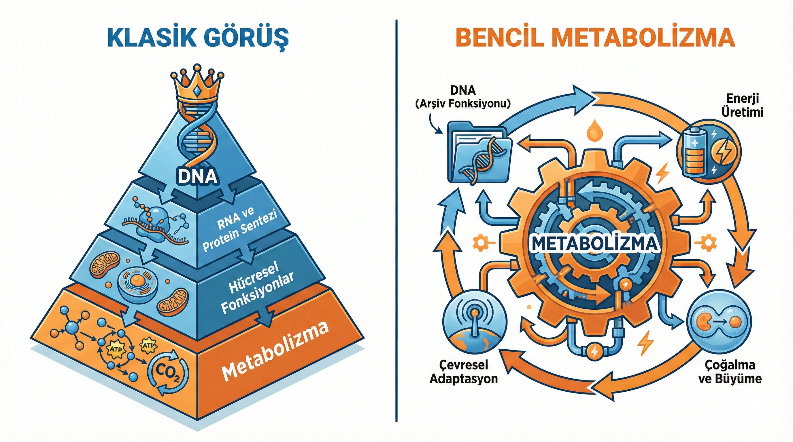Merkezi Dogma Ve Bencil Metabolizma Hipotezlerinin Bilgi Akışı Açısından Karşılaştırılması (Yapay Zeka İle Oluşturulmuştur)