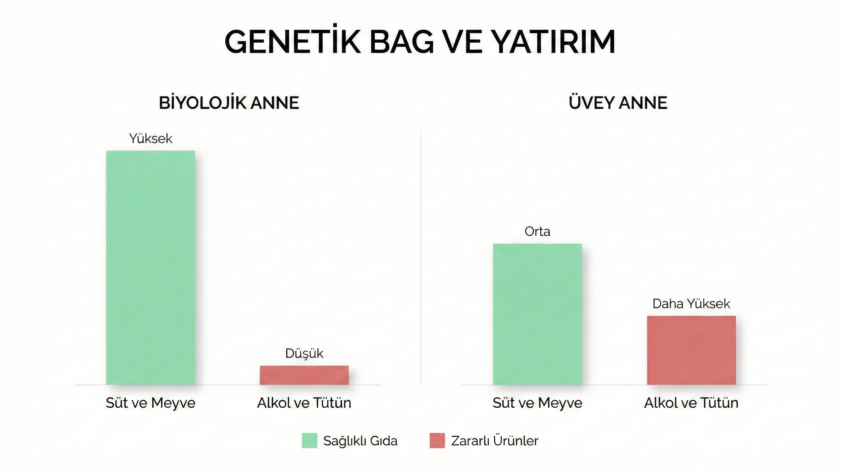 Güney Afrika verileri, biyolojik annenin hane reisi veya eşi olduğu durumlarda süt, meyve ve sebze gibi sağlıklı gıdalara yapılan harcamaların arttığını, tütün ve alkol harcamalarının ise azaldığını ortaya koyar. Bu durum, genetik bağın, gelecekteki ekonomik geri dönüş beklentisinden ziyade, genetik materyalin korunması güdüsüyle (bencil gen hipoteziyle uyumlu olarak) yatırımı şekillendirdiğini düşündürür.
