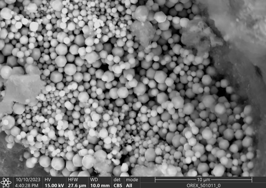 Bennu örneklerinde 1 mikrometreden daha küçük boyutta manyetit (demir oksit) kristalleri tespit edilmiştir. (Rob Wardell, Tim Gooding, Tim McCoy, Smithsonian)