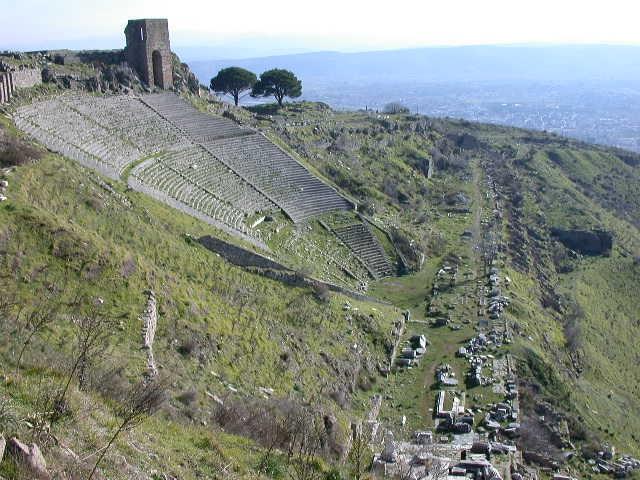 Kale Dağı’nın zirvesinde yer alan antik yerleşim, Helenistik şehir planlamasının önemli örneklerindendir. Zeus Sunağı, Athena Tapınağı, 200.000 kitaptan oluşan kütüphane, antik tiyatro, Trajan Tapınağı, Heroon ve Gymnasion gibi yapılar burada yer alır.