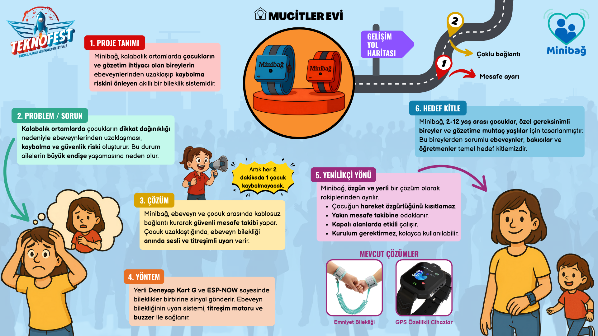 Sengör'den sonra hedefimizi çocuk güvenliğine çevirdik. Zeynep'in piknikte geçici olarak kaybolan bir arkadaşı bize ilham verdi. "Kalabalık ortamlarda çocukların kaybolmasını nasıl engelleyebiliriz?" sorusuyla Minibağ doğdu.