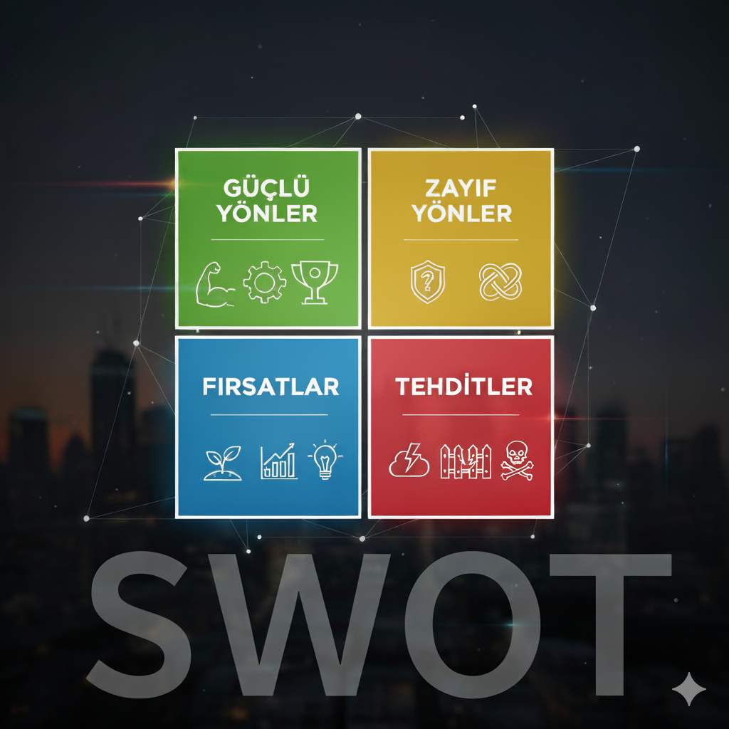 Bireysel markalaşma sürecinin aşamalarından olan SWOT Analizinin unsurları (Görsel yapay zekâ ile oluşturulmuştur)