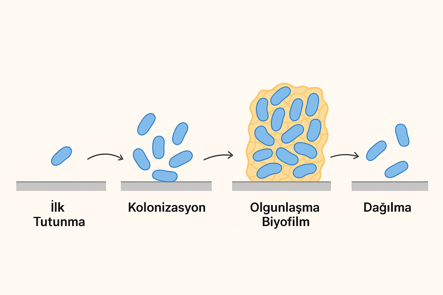 - Başlangıçta Yüzeye Bağlılık: Mikroorganizmalar yüzeye geçici olarak tutunur. Bu aşamada yüzey özellikleri ve çevresel koşullar bağlanmayı etkiler.