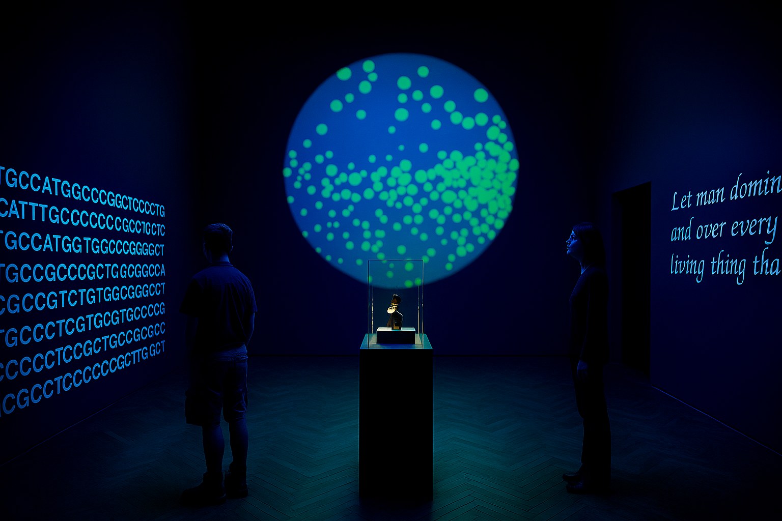 Eduardo Kac'ın 1998 Tarihli "Genesis" Adlı Eserini Tasvir Eden Bir Görsel (Yapay Zeka ile Oluşturulmuştur)