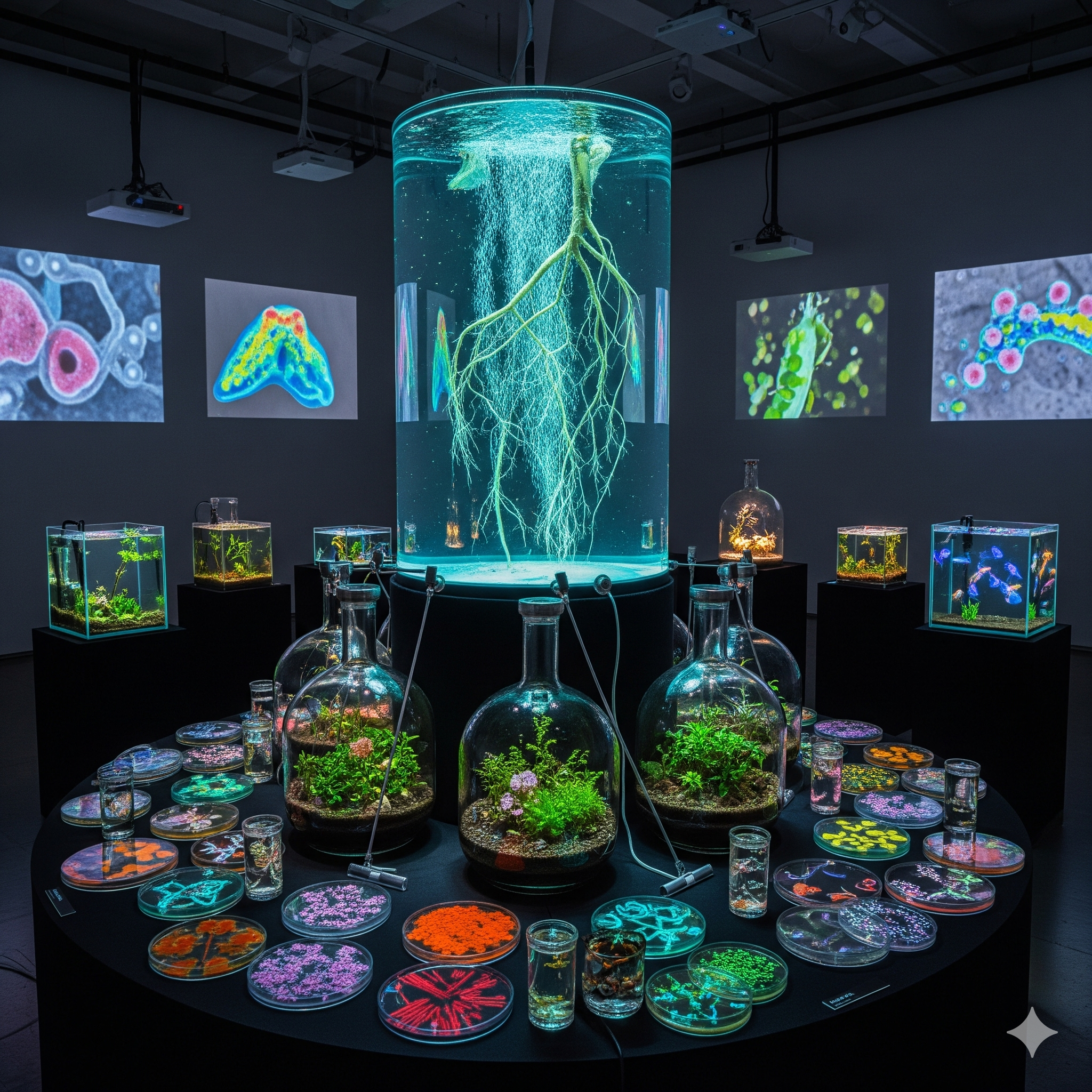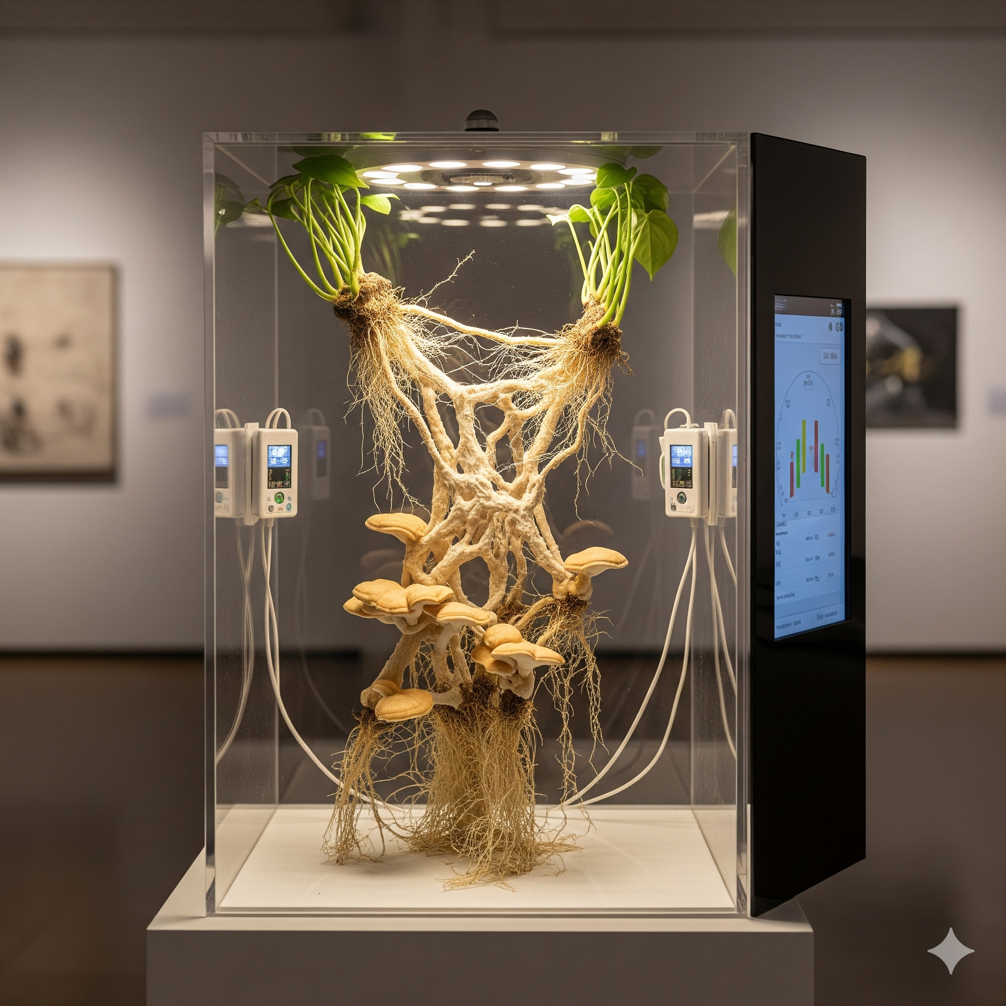 Canlı Mantar ve Bitki Köklerinin Bir Sanat Eseri Olarak Sergilendiği Biyosanat Örneği (Yapay Zeka ile Oluşturulmuştur)