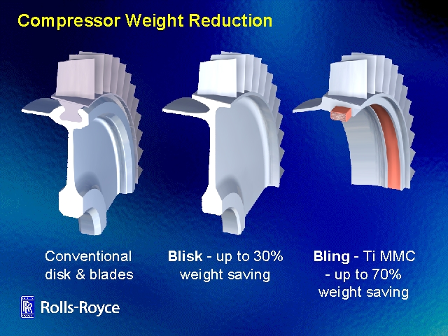 Bling teknolojisinin sunduğu en büyük avantajlardan biri, geleneksel motor disklerinin ortadan kalkmasıdır. Blisk adı verilen entegre disk ve kanat yapısının yerine, MMC ile güçlendirilmiş halka yapısı kullanılır. Bu sayede, disk göbeği kaldırılarak ağırlık tasarrufu sağlanır ve aerodinamik verimlilik artırılır.