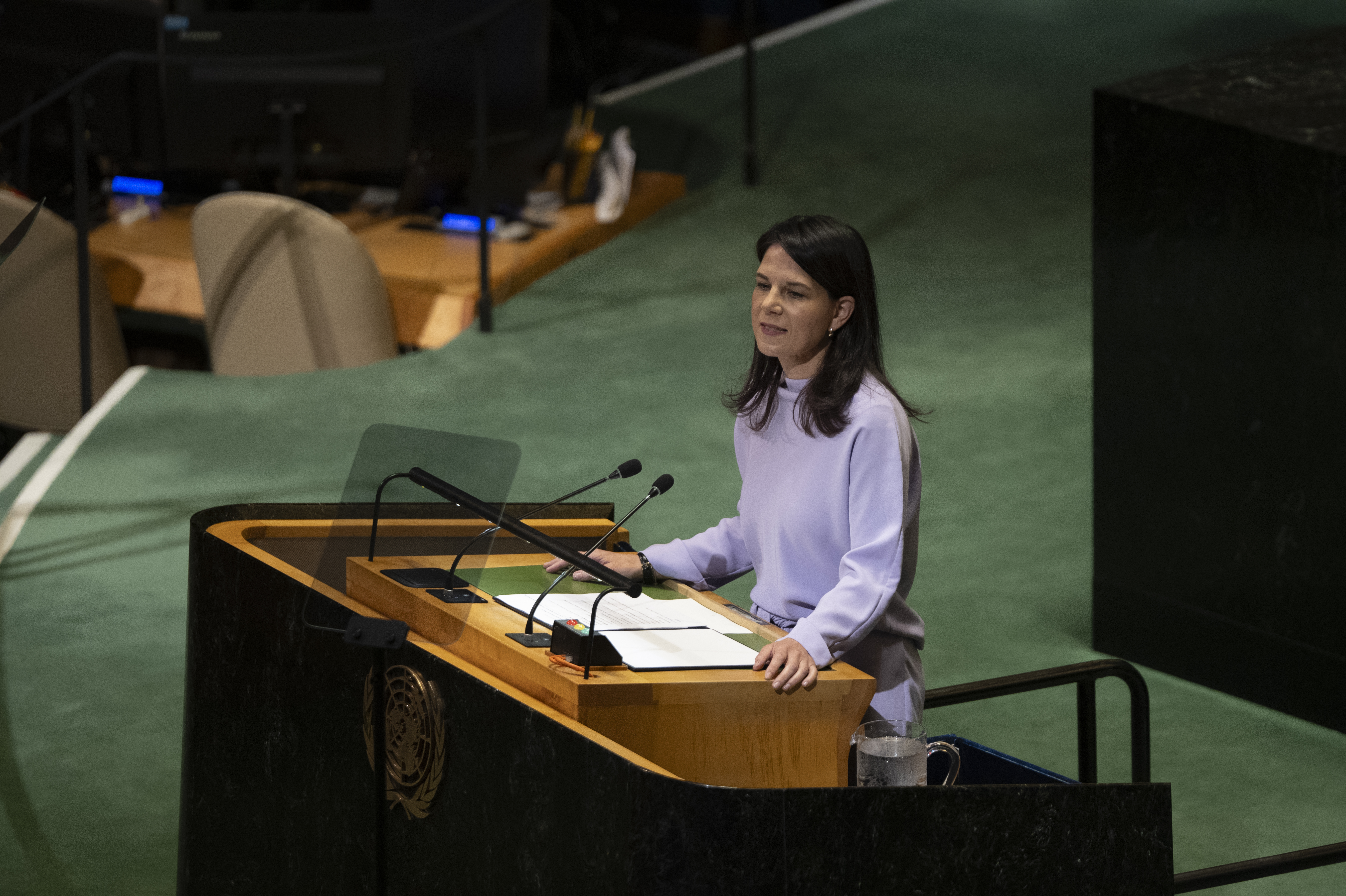 Genel Kurul Başkanı Annalena Baerbock, oturumda yaptığı konuşmada Filistin halkının uzun süredir haklarından mahrum bırakıldığını vurgulamıştır. Baerbock, “78 yıldır Filistin halkı devredilemez haklarından, özellikle de kendi kaderini tayin hakkından mahrum bırakılmıştır.” ifadelerini kullanmıştır. Ayrıca, 7 Ekim 2023’te Hamas tarafından gerçekleştirilen saldırıların “çatışmanın en karanlık bölümlerinden biri” olduğunu iddia etmiştir.